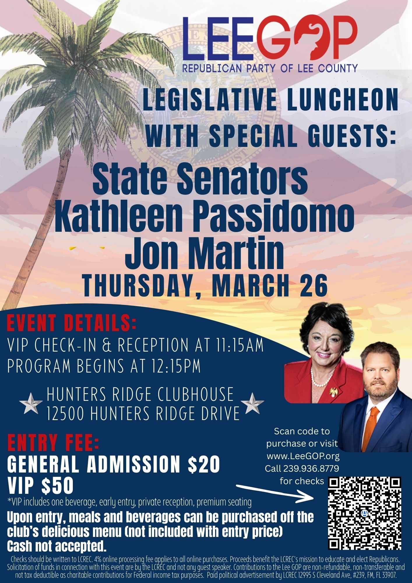 Join Florida state senators Kathleen Passidomo and Jon Martin, as well as your Lee County GOP as we learn about the 2026 legislative session the whole country has been talking about!