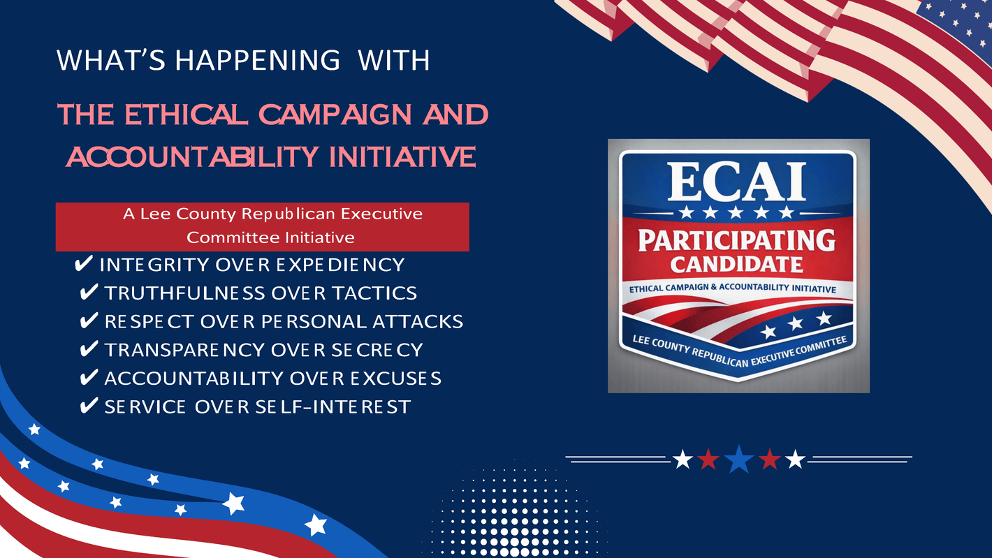 The Lee County GOP, under the leadership of Chairman Mercedes Price-Harry, will be spearheading an Ethical Campaigns and Accountability Initiative, created to hold our candidates and elected officials accountable in conducting their campaigns (and themselves) in a way that is ethical and fitting for a Republican. In the Lee County GOP we want to see…
