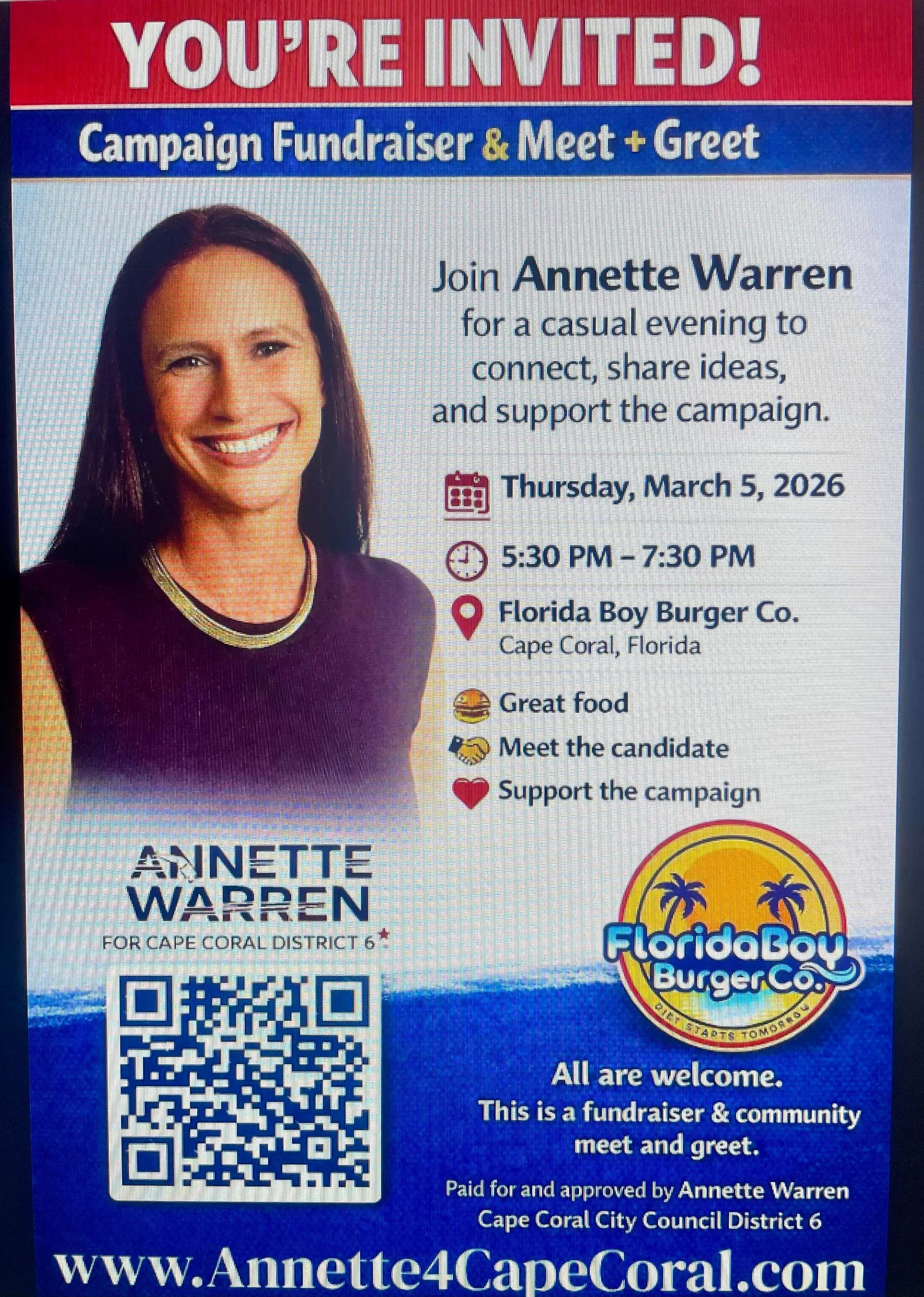 You are Invited to join Annette Warren for a casual evening at locally owned Florida Boy Burger Cape Coral, to connect, share ideas, and support Annette’s campaign. All are welcome. VOTE for Annette.