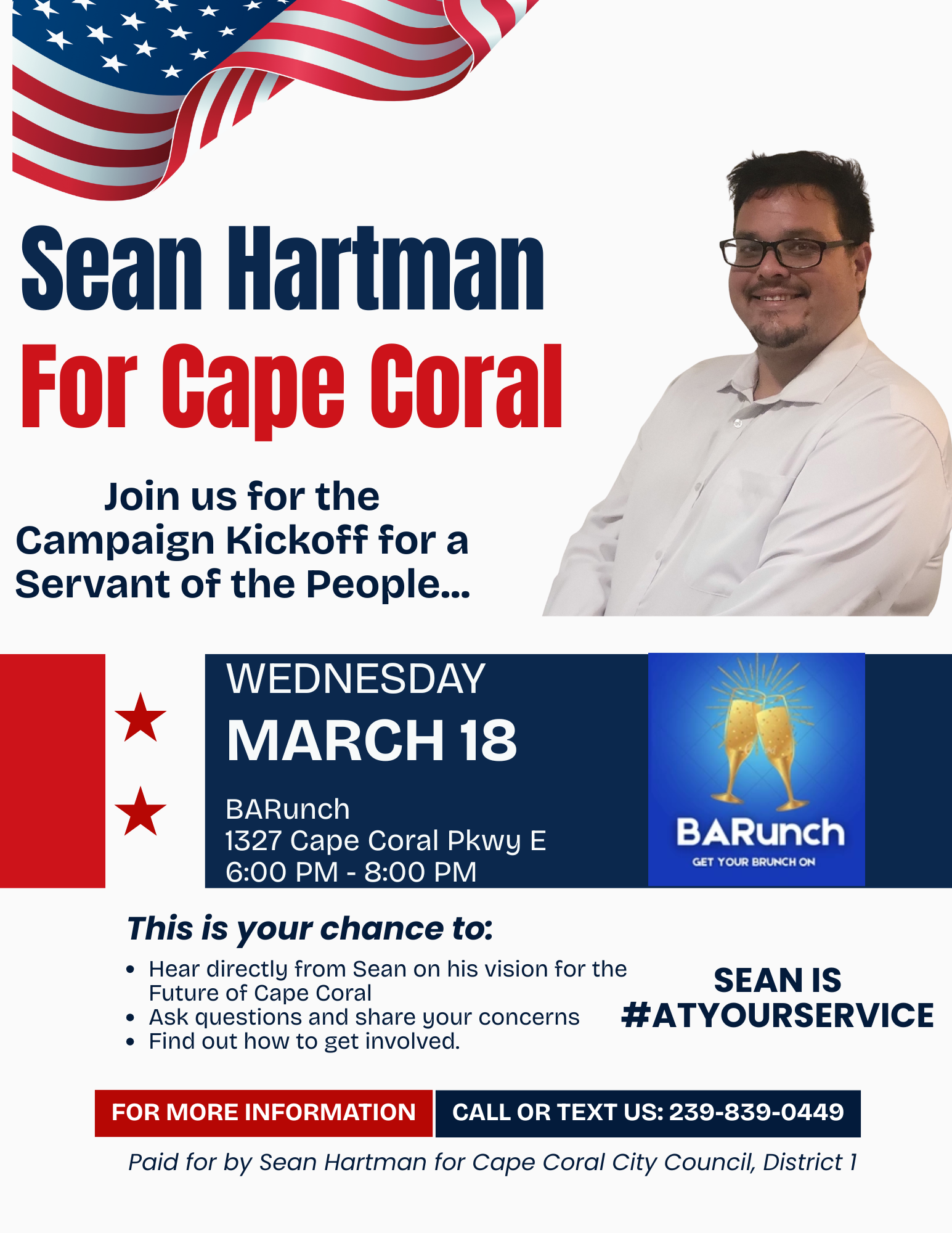 Come meet Sean Hartman, candidate for Cape Coral City Council, District 1. Sean is running to serve the people of Cape Coral and he wants to know what issues matter to you. The public is invited to speak to Sean, address their concerns, and find out how they can help the campaign.