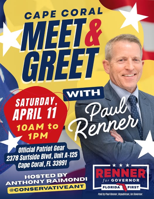 Cape Coral, come out and meet Paul Renner on Saturday, April 11 from 10:00 AM to 1:00 PM at Official Patriot Gear 🇺🇸