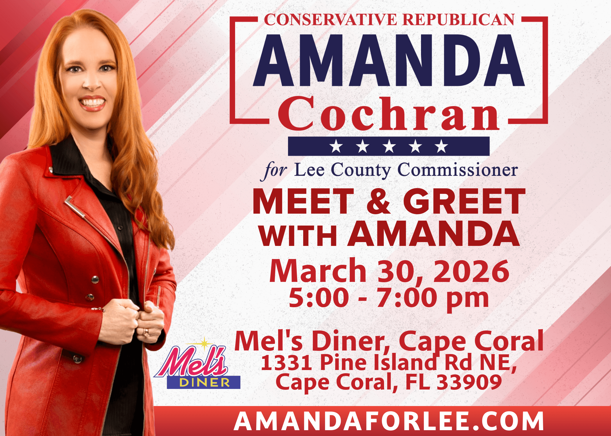 Come out on Monday, March 30, 2026, from 5:00 PM to 7:00 PM at Mel’s Diner in Cape Coral to meet Amanda, hear directly from her, and connect with others who care about the future of Lee County.